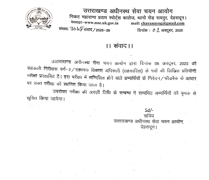 यूकेएसएसएससी की पांच अक्तूबर की परीक्षा स्थगित